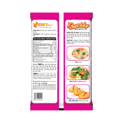 Công dụng: Bột bắp thường được sử dụng để tăng độ kết dính và làm sánh trong các món ăn khác. Làm bột phụ trợ cho các loại bánh như gato, cupcake, cookies… Tạo độ sánh đặc cho các món ăn như nước sốt, súp, kem lạnh…